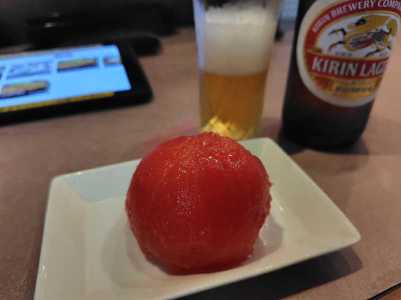 さて、お食事処で、まずはビール&トマトの漬物。これ初めて食べたけどめちゃ美味しい🍅(リピ確定)