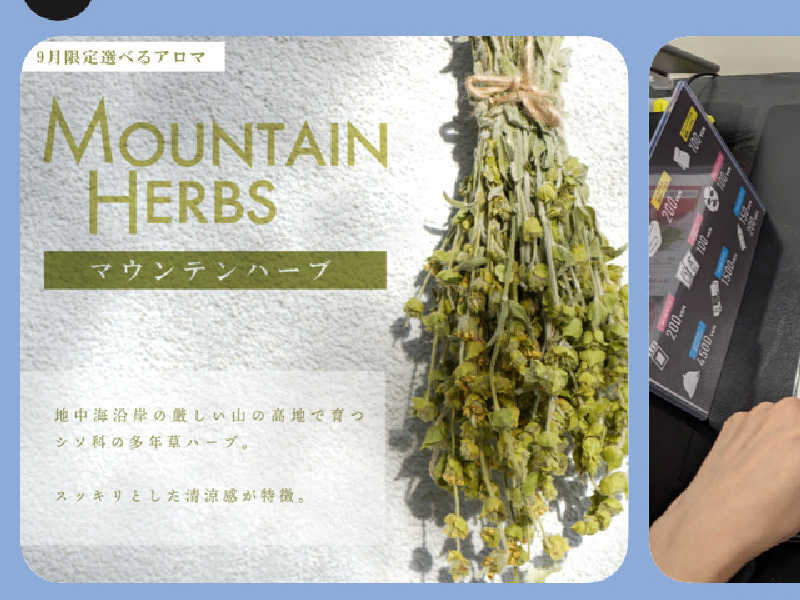 マンスリーアロマ、マウンテンハーブをサ室100° で利用しました。90°、95°の体感を振り返ると温度が上がるとハーブ香がやわらいでいった感じでした。