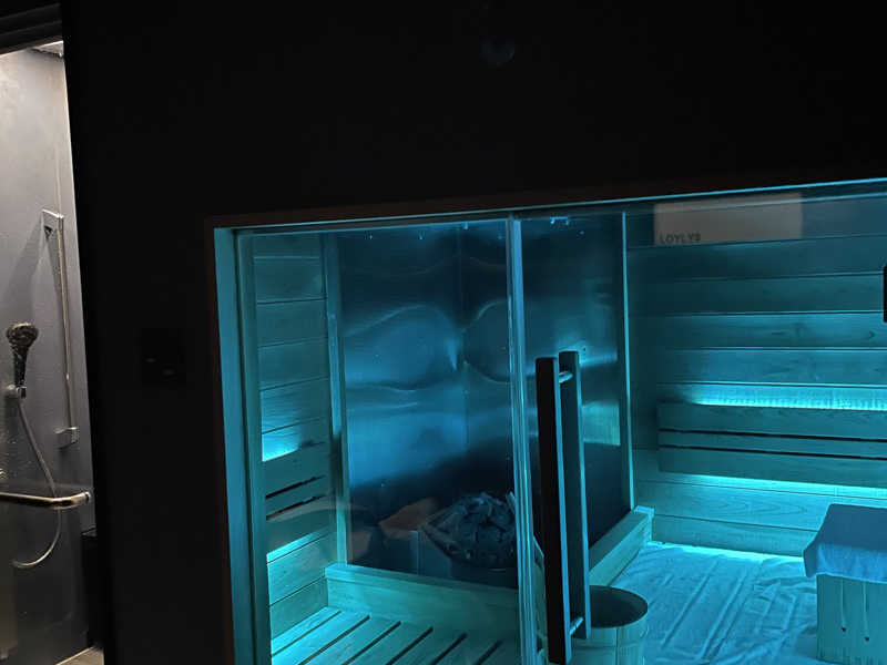 サウナ付きの部屋に泊まってみました。レイアウトはサ室を中心です、ロウリュできます、バスタブは無くシャワーで、部屋テレビは省略?オロポ冷やす冷蔵庫はある!整いスペースもコンパクトながら有ります、この部屋特権で営業時間中CAVESPAを水着着用でサ室も、プール滝シャワーや屋外スペース自由出入り
