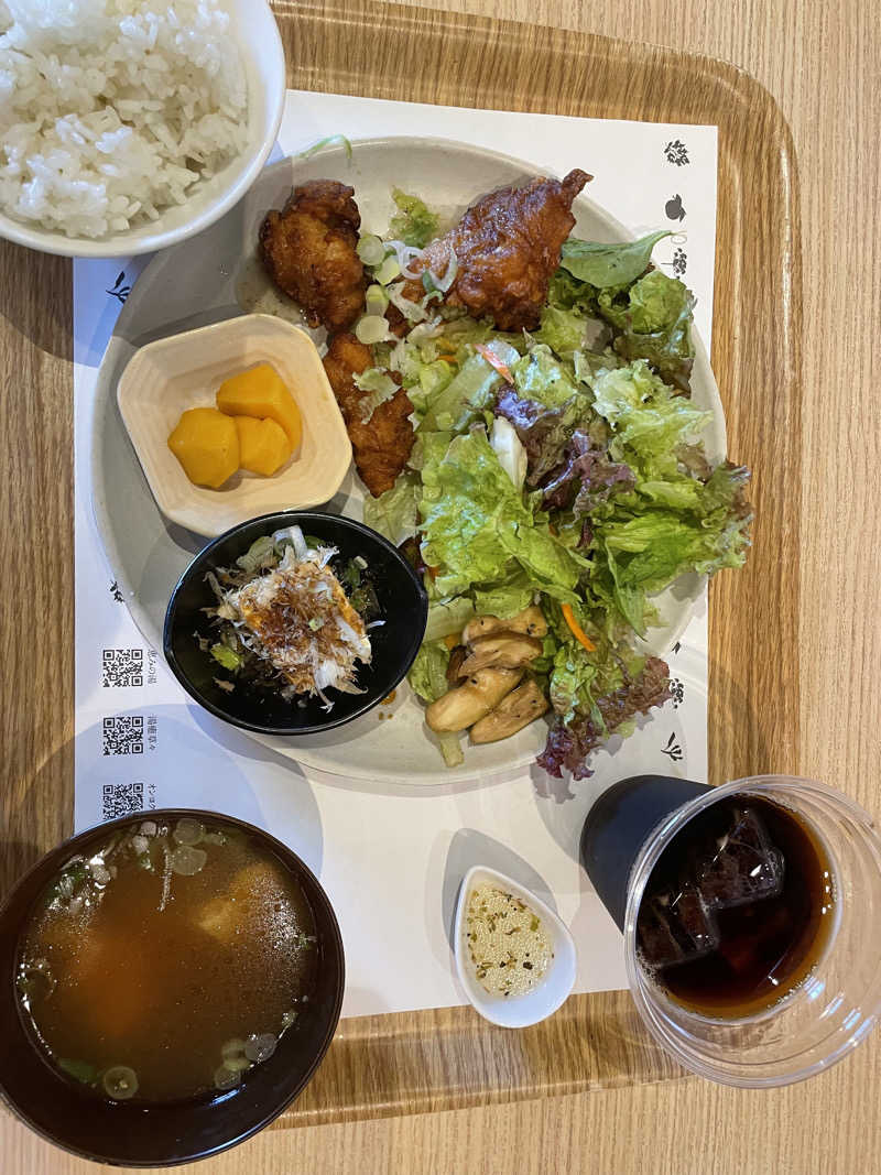 サ飯は館内にて、日替わりランチ(鳥の唐揚げ〜ネギ塩ソース〜)😋唐揚げうまいし、ネギ塩ソースがうまみを倍増😆豚汁や野菜類もうまい、飲み物(コーヒー)も頼めて幸せホルモン出まくり😎