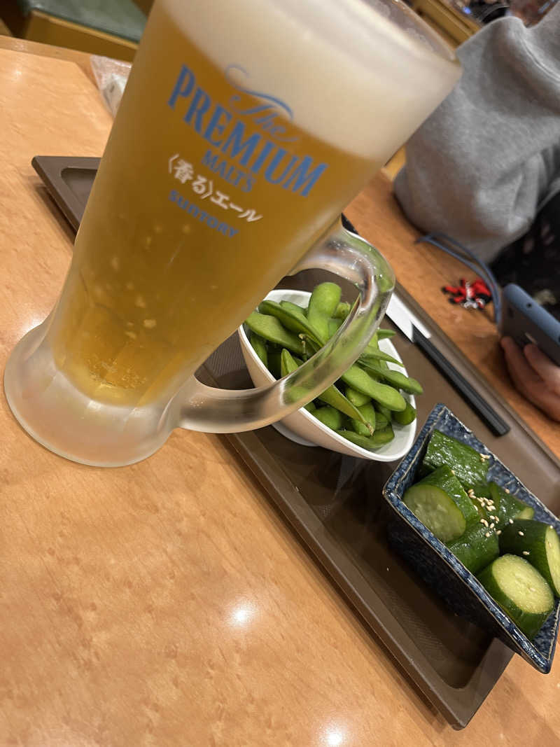きゅうりと枝豆 缶の黒ビールでハーフ&ハーフ