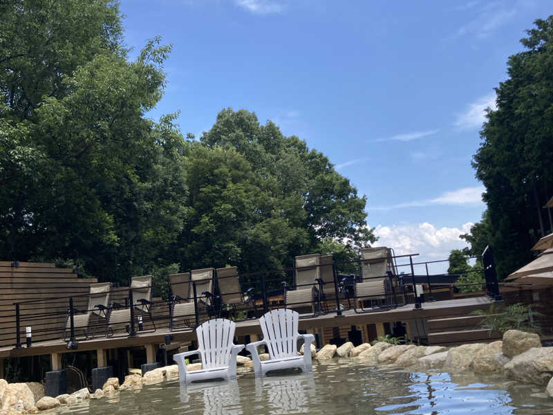 サ道で、ナカちゃん達が座っていた場所には寝そべりチェアーが置いてあり、反対側にドラマでお馴染みの白い椅子が並べてある。その真ん中に座ってみる...