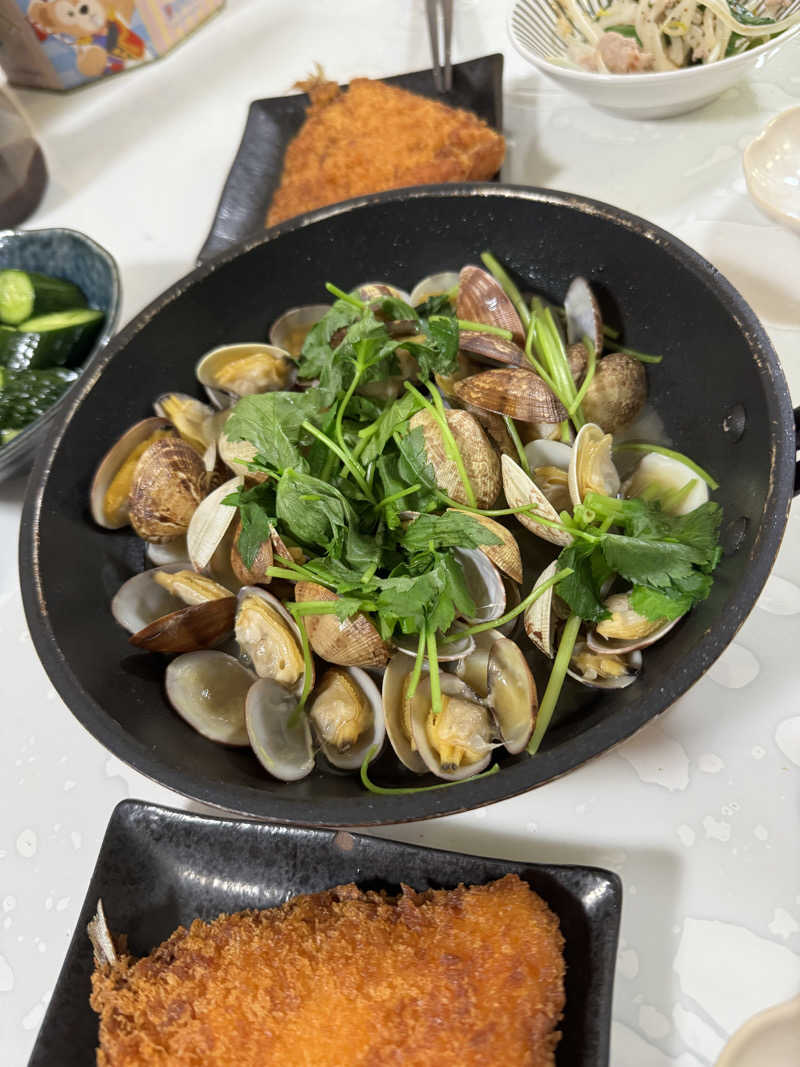 車の温度計が39度という灼熱の日 総支配人のロウリュを求めてin ほうじ茶でまったりロウリュ タオルで蒸気を撹拌させながら温まる 換気挟みながらじっくり蒸されてゆく ラスト鬼ロウリュで灼熱サ室からのシングルへ 本日も最高に爆整いでした😇 朝から塩水で冷暗安置していたアサリをお酒で ロウリュしサっとフランベしてから蒸してゆく