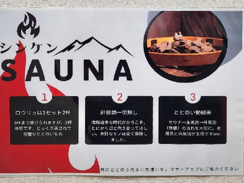 身体を洗って、扉に貼られていたセルフロウリュの説明書きを一読🙄