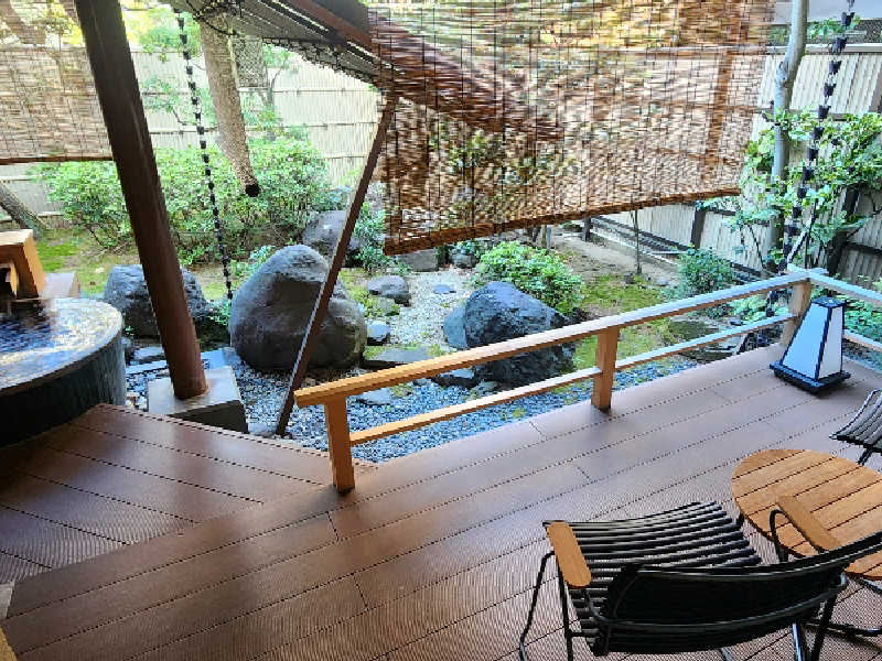 内湯内にベンチ、露天にも寝そべれそうなウッドデッキスペースと、ハンモックタイプの椅子が3脚。