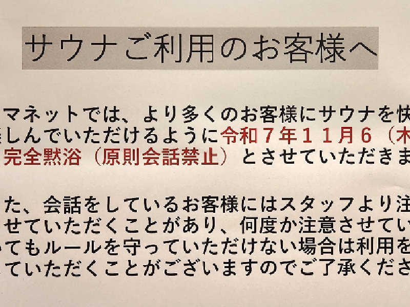 そして、11月からロマネットは完全黙浴になるみたい! サ室でも大声でしゃべるうるさい常連いるから、抑止力になるといいな😀