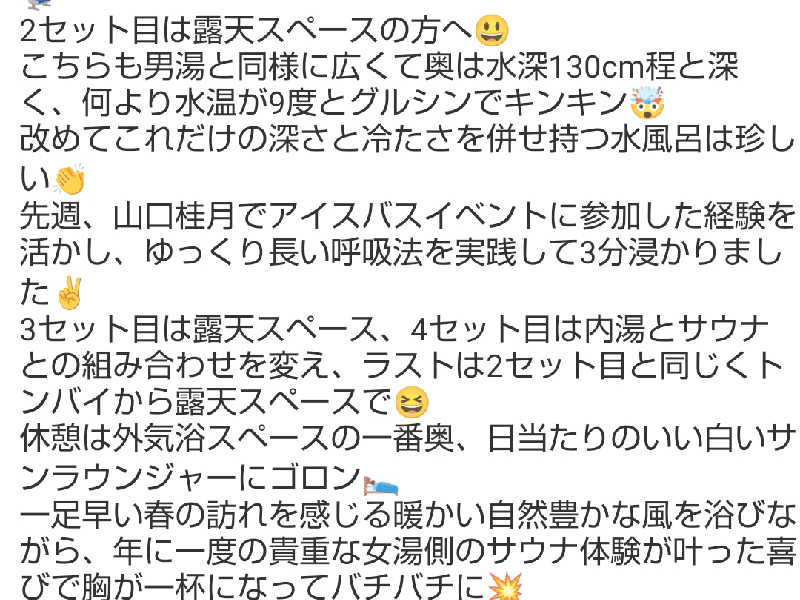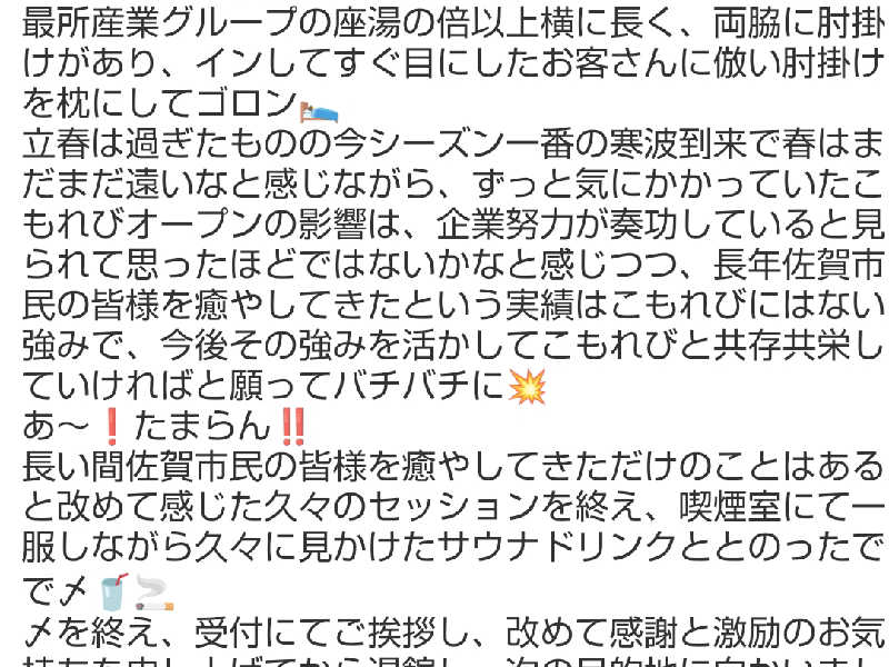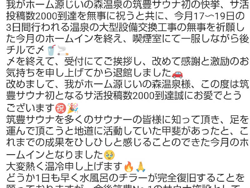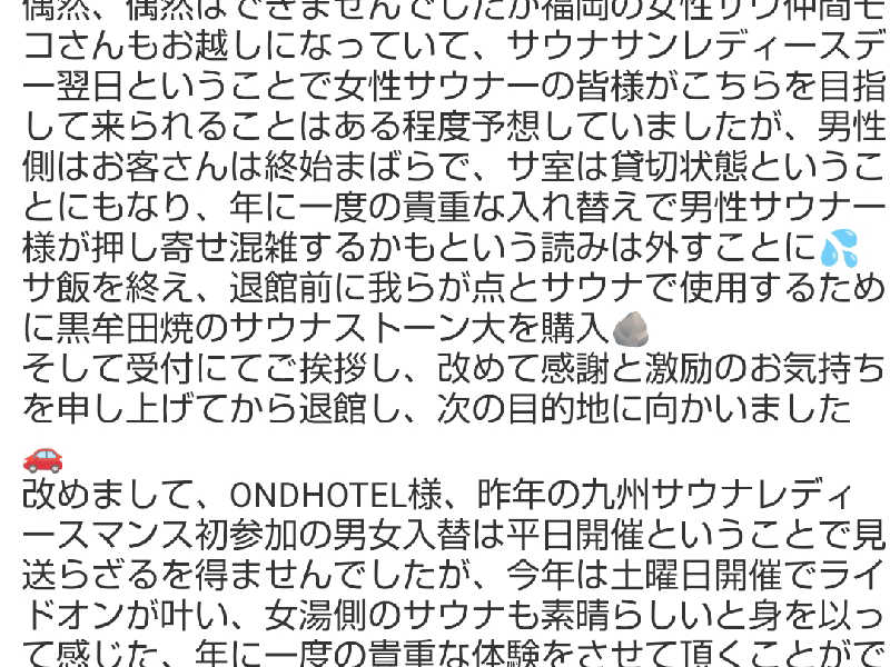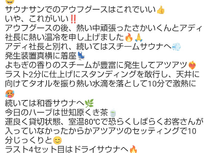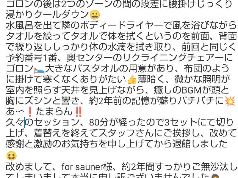 また、サウ仲間の皆様はもちろんのこと、我がホーム源じいの森の顔見知りの常連さん、眼鏡長髪お兄さんも実際に体験されて大絶賛されていてずっとイキタイ欲が湧いていました❤️🔥
