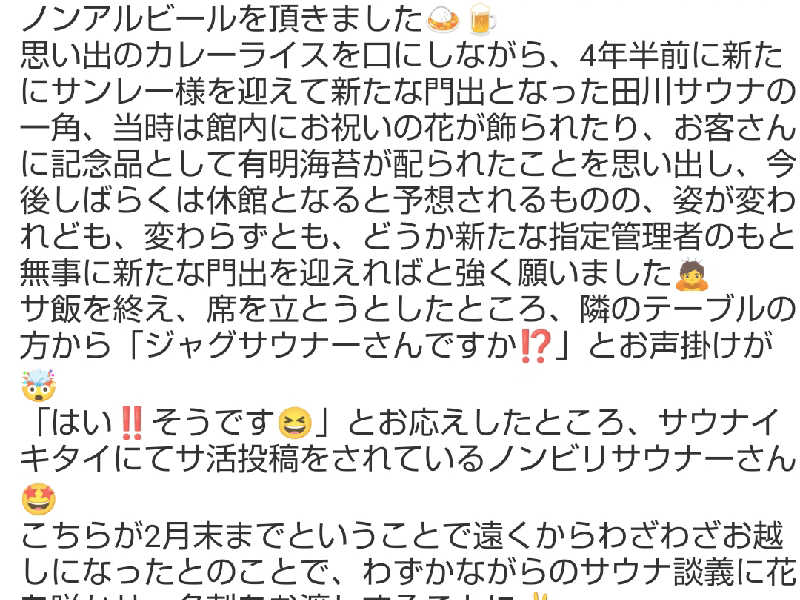 若手スタッフのみやざきくんがいらっしゃったのでご挨拶し、しばらくサウナ談義に花を咲かせてから改めて感謝と激励のお気持ちを申し上げてから退館し、今日のサ巡りに向かいました🚗