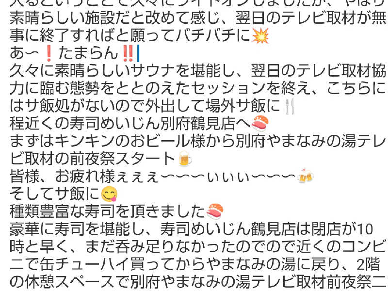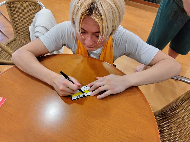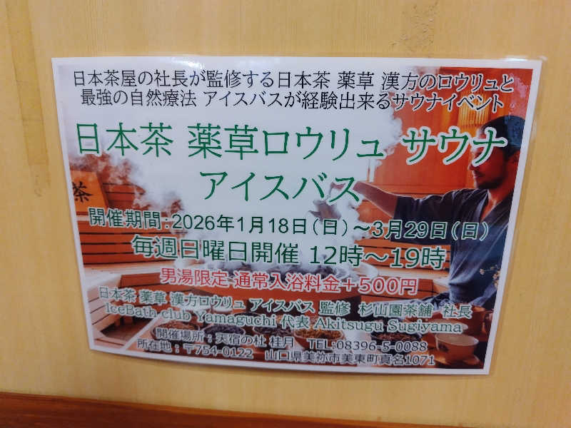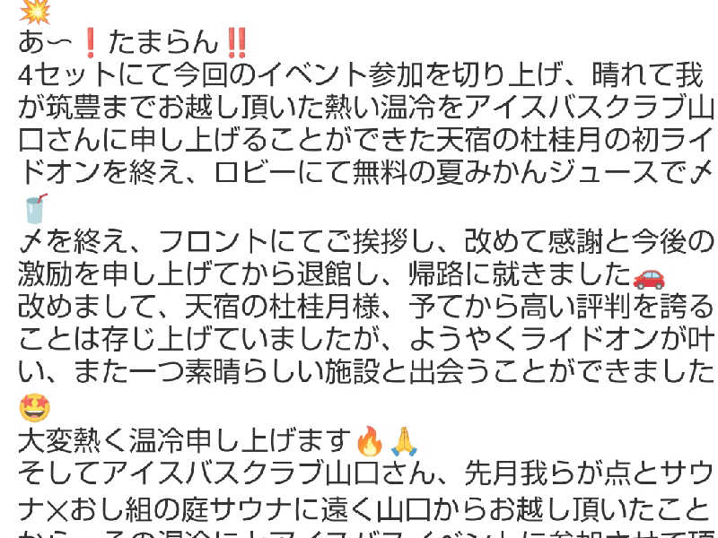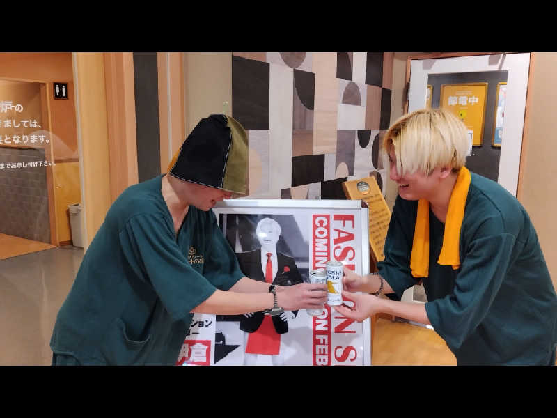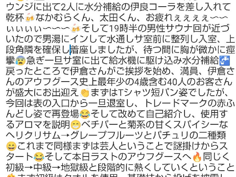 別府やまなみの湯でのテレビ取材を終え、今日のサ巡りは一路北へ🚗東海地方を中心に活動されるお笑い芸人兼ふんどしアウフグースマスター伊倉ゆうさんが九州初上陸👏懇意にさせて頂いているサウ仲間カッパのまこちゃんさんの推しということで是非ともウケタイと思いこちらにライドオン🤩🔥インして受付にて早速ポチョムキン太田くん、湯ケメン支配人様が😄ご挨拶を申し上げ、奥に向かうとサウ仲間カッパのまこちゃんさんが🤯偶然❗偶然‼️この度は念願叶って推しの伊倉さん九州初上陸実現、誠にお愛でとうございます㊗️🎉とお祝いを申し上げました😀するとお馴染みのサウ仲間の皆様が続々とお越しになり、ラウンジにて熱い熱いサウナ談義に🔥すると本日の主役、伊倉ゆうさんが準備のためラウンジに🤩伊倉さんに初めましてご挨拶を申し上げて記念撮影📷️ご挨拶を終え、その後もサウ仲間とサウナ談義に花を咲かせてから今日のイベントの一発目、15時半の男性サ室回が近づいたので男性サ室に入り、準備し水通しを敢行して整列へ😄その際にサ室に敷くウレタンマットが黒い横長のものに変わったのを発見👀ちょうど種本副支配人様がいらっしゃったので尋ねた完全に入れ替えというわけではなく従来のマットと併用していくとのことでした🤔入室が開始し、上段横を確保し、開始の時を迎え、36人と満員近くのお客さんの大歓声の中、伊倉さんがご挨拶をして自己紹介👏