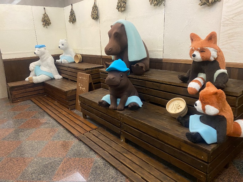 動物園で有名な旭川らしく、エントランスではたくさんの動物さんたちがお出迎え。サのある地下のエレベーター前も動物たちがサウナに入っているオブジェが❗️か、かわいい〜
