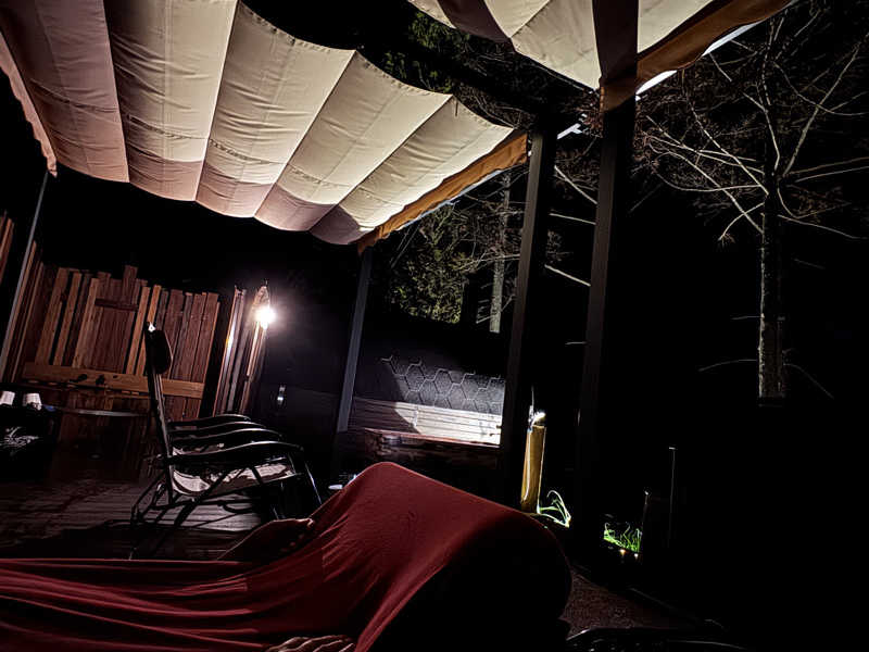 この季節は夕方から夜にかけて、25℃ぐらいまで下がるので、外気浴がめちゃめちゃ気持ちいい!したがって長ーいサウナになってしまう!