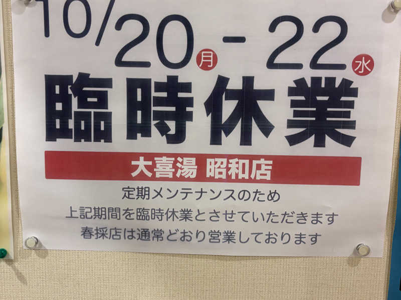 大喜湯昭和店、10月20日から22日は臨時休業です。