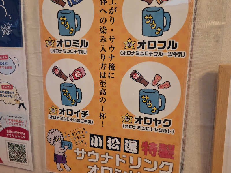 一言:今日は天気も良く、仲見世通りの暖暮で腹ごしらえしてからの小松湯までウォーキング。小便小僧のお出迎えを受けるとワクワクします。まずは身体を清めてから、ガリウム石温浴泉で身体を温めてからのストロングなサ室へ。おっと、第一セットから上段しか空いてないとは、冗談じゃないよー。と心の中で叫びながら、上段へ。大魔王ヤカンとにらみ合いしながらも、6分でギブ。水風呂は今日もキンキンで30秒でアウト。脱衣場の椅子に座ったら、生きてる実感が身体の中から湧き出てきて、気持ちいー。意識が飛びそうになりました。こちらに来たら週刊マガジンを読むのも楽しみ。休憩の合間にマガジン読みつつ、4セット。今日は寝風呂もミントな感じで気持ち良くて、すごく良いサウナでした。風呂上がりには気になっていたオロヤクで水分補給。いや~来週も頑張れそうだ!