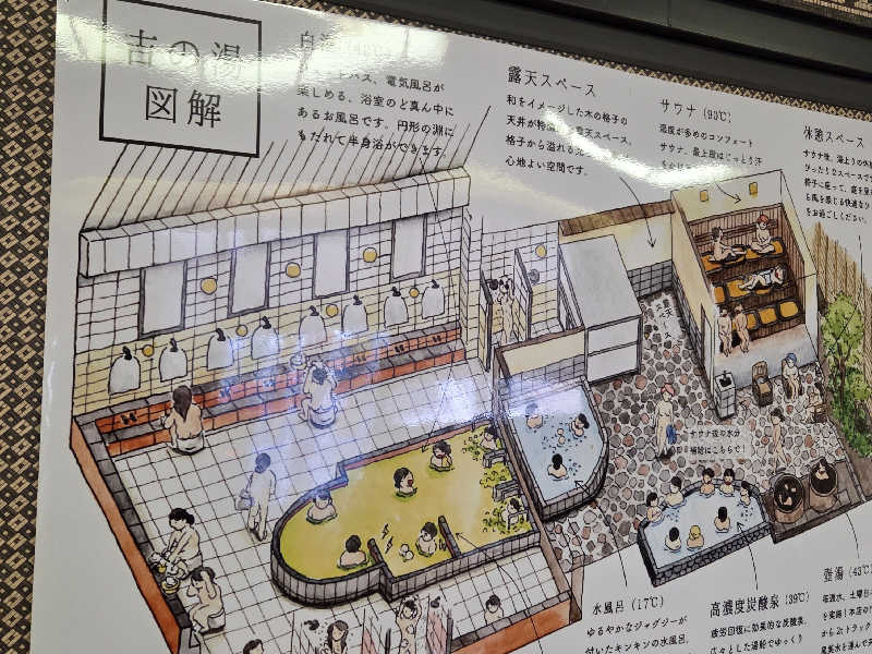 一言:東急井の頭線、永福町駅から徒歩20分、行ってきましたよ吉の湯へ。サ道1stシーズン第3話で登場するこちらは、人気の施設。最寄り駅から遠いため、天気も考慮し涼しくなった秋晴れの本日ようやく訪問。サウナは時間によっては待ちが出るようですが、待ちなく入れてラッキー。浴室はコンパクト、何故ならば露天が充実してるからです!身体を洗って早速主戦場となる露天へ。まずは炭酸泉、キモティー。あったまってからいよいよサ室へ。3段のコンフォートサウナ、トントゥもいて雰囲気良し。スペースの関係でいきなりの上段へ。恐る恐る上段へ行ったけど、思ったほど苦しくはなく、寧ろ気持ち良き。じんわり内側から温めてくれる。温もるわー。いよいよ水風呂へ。18℃くらいの水風呂はバイブラもあり、冷たさを保ってくれる感じが良い感じ。露天の椅子は6脚しかなく、そこそこ競争率高めでしたが、少し待つことで座れました。リクライニングチェアから見る秋空は最高ですね!帰りに銭湯カードもゲットできて、最高のサ活でした。