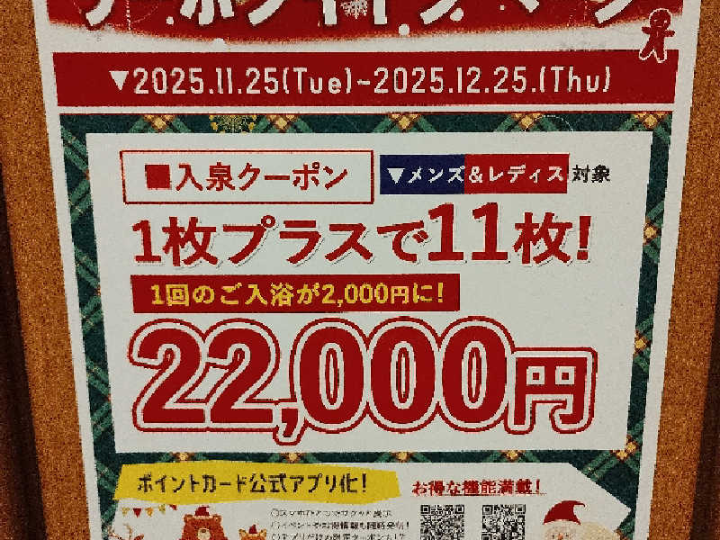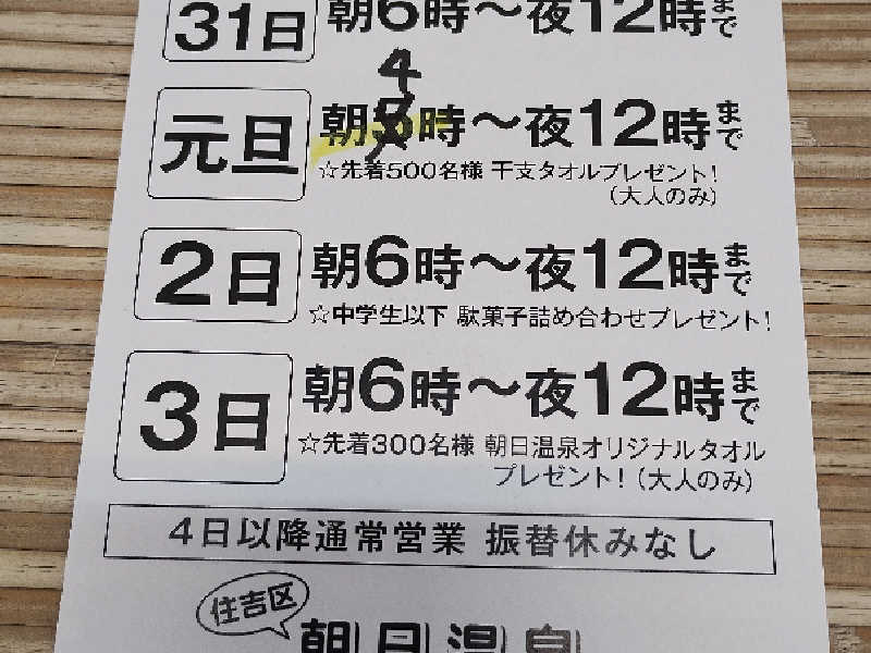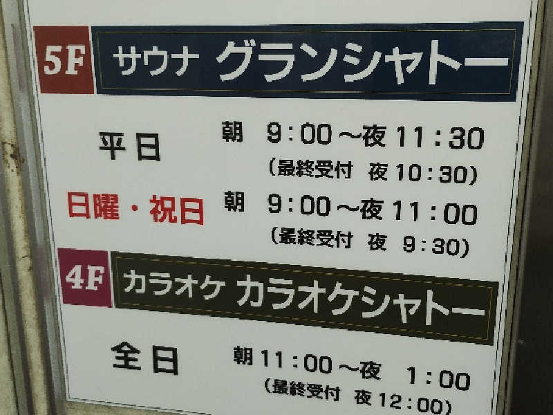 サウナ8〜9分 5セット。期待通り以上のガッツリサウナで全身シャキッとビックリです。かなりのクオリティーのコチラは駅からのアクセスが難です。本日はありがとうございました。13時半に退館しました。 大将に早くも年末年始の営業時間の告知をいただきましたのでご参考まで。