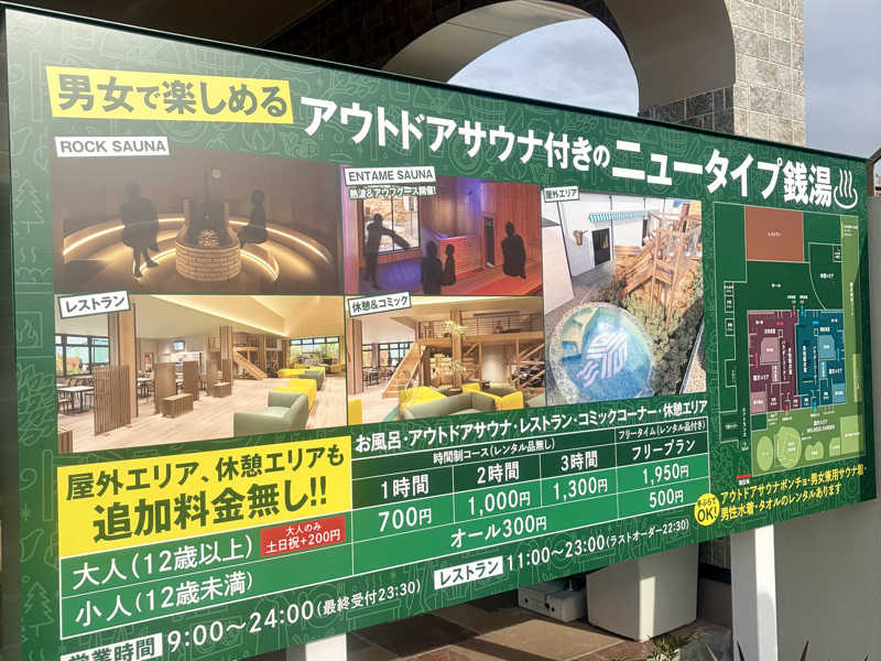 一言で表すと、エンタメサウナ施設です!湯舞音とCOCOFUROとサウナパークの良い所取りしたスーパー銭湯でもなく、サウナ施設でもなく、銭湯でもない、それらが融合したシン施設!