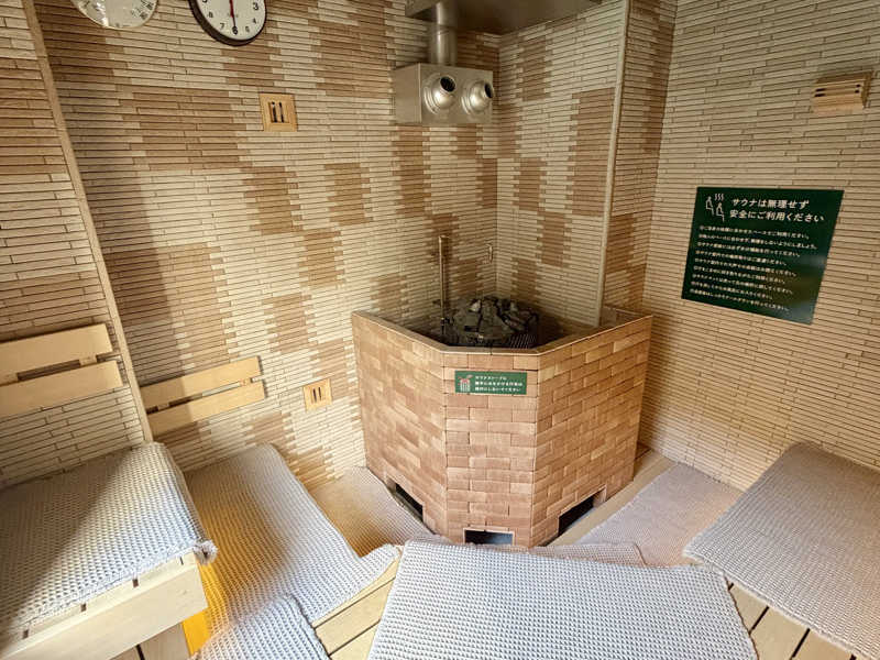 フィンランド式サウナはセルフロウリュが可能で、じゅわ~っと広がる蒸気に包まれる感覚がたまりません!サ室温度は約90℃好きな温度と湿度で嫌な熱さもなく10分程よく入れました!