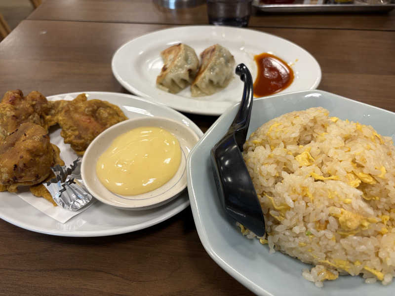 玉子チャーハン、ジャンボ餃子(小盛り)、そしてカレー唐揚げ(小盛り)。カレー唐揚げはやっぱり外せない、安定のマストメニュー。