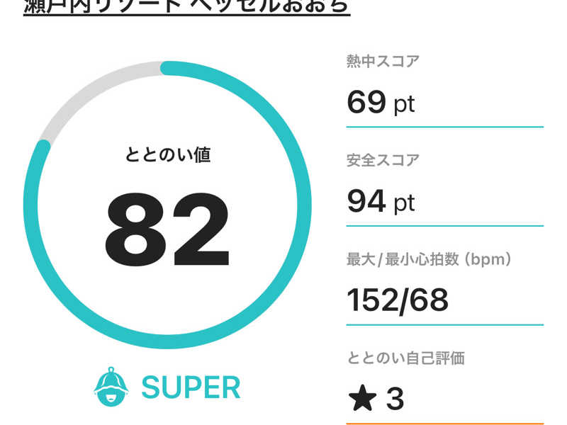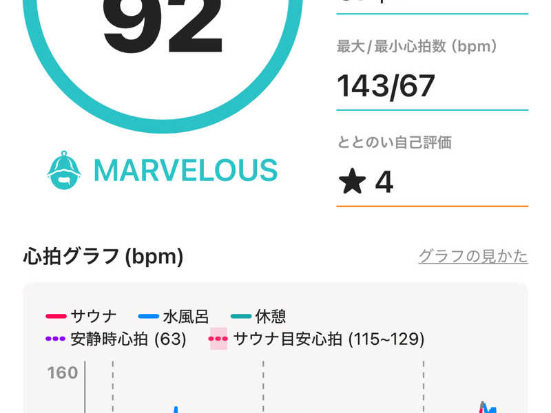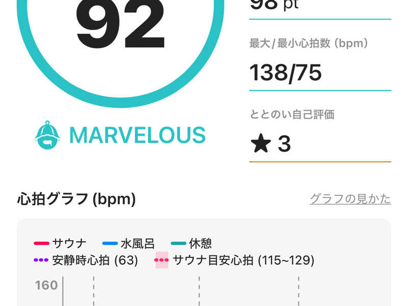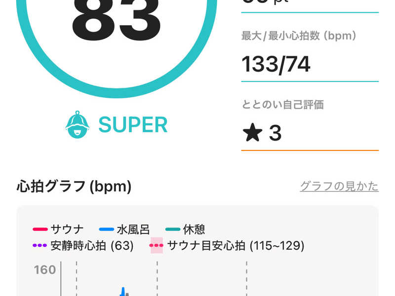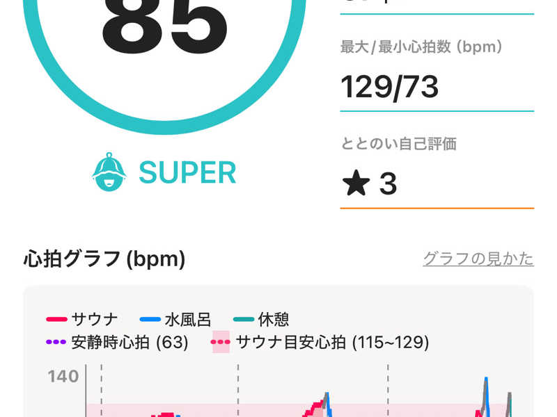 10分経過し心拍数135bpm↑水風呂〜外気浴ベッドへ