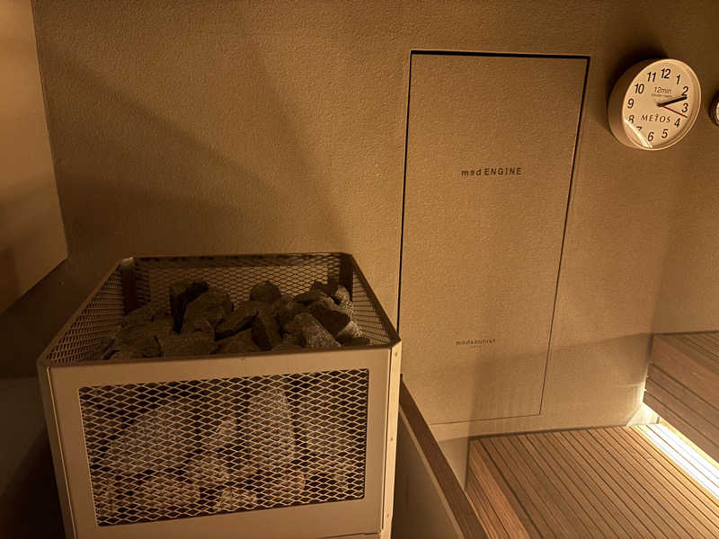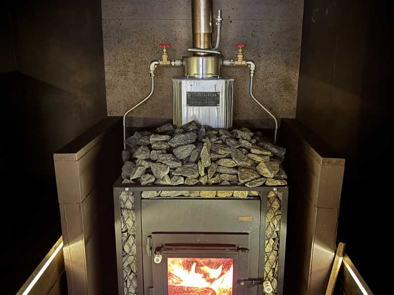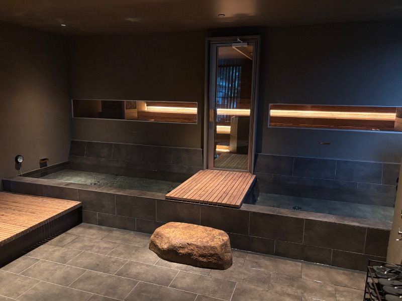 サウナは3段。かなり広い。ストーブは2つ。madsaunistさん監修。温度85℃前後、湿度40%前後。空気循環も素晴らしく、クナイプも出来る。素晴らしいサ室環境。