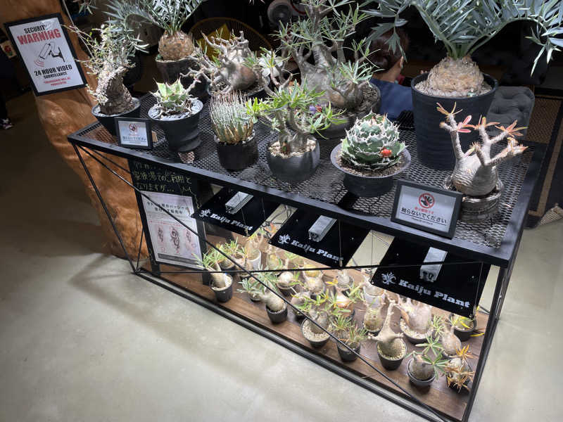 丘の上にあって徒歩では坂道が大変ですがバスで割とすぐ近くに停まるルートがあったのでそれで向かいました。1-2時間に1本しか無いので注意が必要。9:40頃IN。到着すると塊根植物がお出迎え。券売機で入浴料を支払って扉の奥の浴場エリアへ。全体的に南国風のデザインのようです。脱衣所ロッカーは少し狭め。100円返却式のロッカー。浴場は露天風呂が広め。露天風呂から海が見えて絶景です。サウナは入口に昭和ストロングの案内。サ室は2段のテレビ無し。オリンピアの遠赤ストーブの前にL字型の席。ストーブの真横の席はストーブ熱が直接届いてアチアチでした。2段目の奥には10㎠くらいの小窓があって露天風景を眺められます。100度前後で中々のサウナ環境。6-7名程度のサウナが一杯になる時間帯も。サウナハットのお客層が多かったです。水風呂は温泉の源泉を冷やしたという水風呂。冷たくて気持ち良いです。ととのいスペースは外気浴。アディロンダックやインフィニティチェアが沢山あります。賢者の椅子という木の椅子も3脚ありました。とにかく沢山のととのい椅子。南国風の露天スペースで海を眺めながらのインフィニティチェア。最高。ここは意外と穴場ですね。