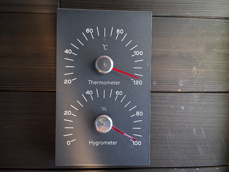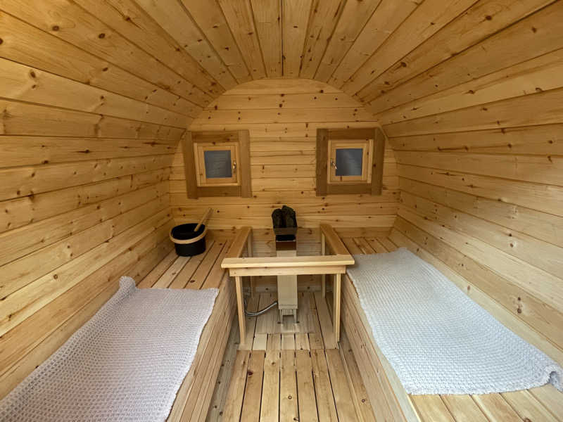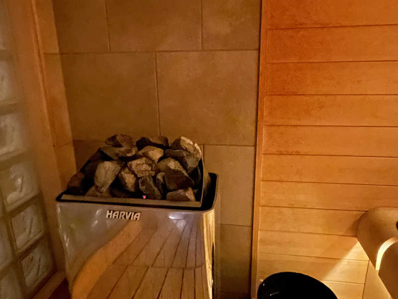 スイッチを入れたら40分くらいでコンディション出来上がるとあったから、食べ始める前にスイッチ入れておいてちょうどいいくらい。しっかり90℃いってる。こじんまりとしたフィンランド式のサ室は2人でピッタリ。目の前がストーブだから、ロウリュすると速攻で蒸気が降りてくる。まだまだ新しい木の香りのするところへ、森の香りのアロマオイル追加。まるで針葉樹林で森林浴か!みたいな錯覚に陥る。タイマーはないけど5分の砂時計があったから、何度もひっくり返しながら温まっていく。ホテルのサウナと侮るなかれ、ホントにちゃんと滝汗にしあがるのさ。