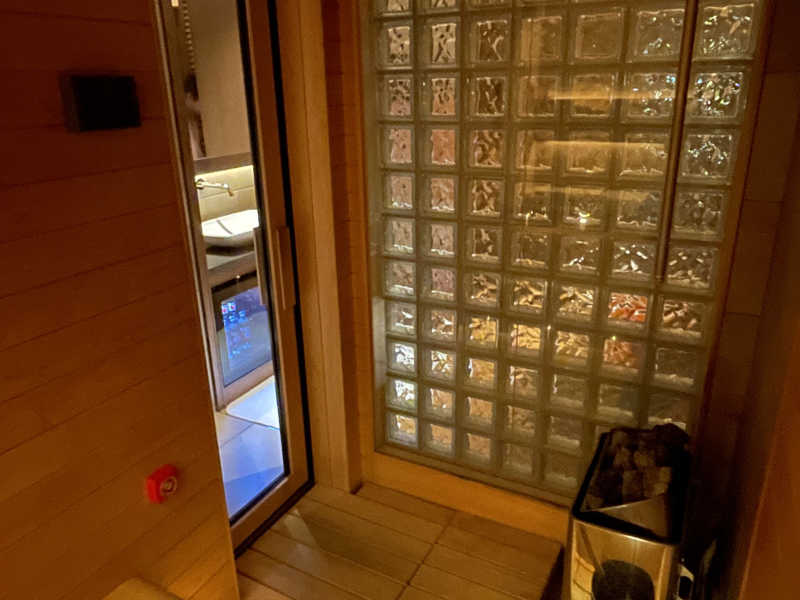 2段の座面は6人くらいは座れそう。こぢんまりとした室内には十分な大きさのストーブ。温湿度計と砂時計。湿度は50%と良いコンディション。セルフロウリュもできるから好きなように調整できる。BGMはないけどプライベートだから携帯から好きな音楽かけれるし、ホテルサウナにしてはクオリティ高くない?こんな都会のど真ん中で?しかも宿泊代だけで追加なしだよ?