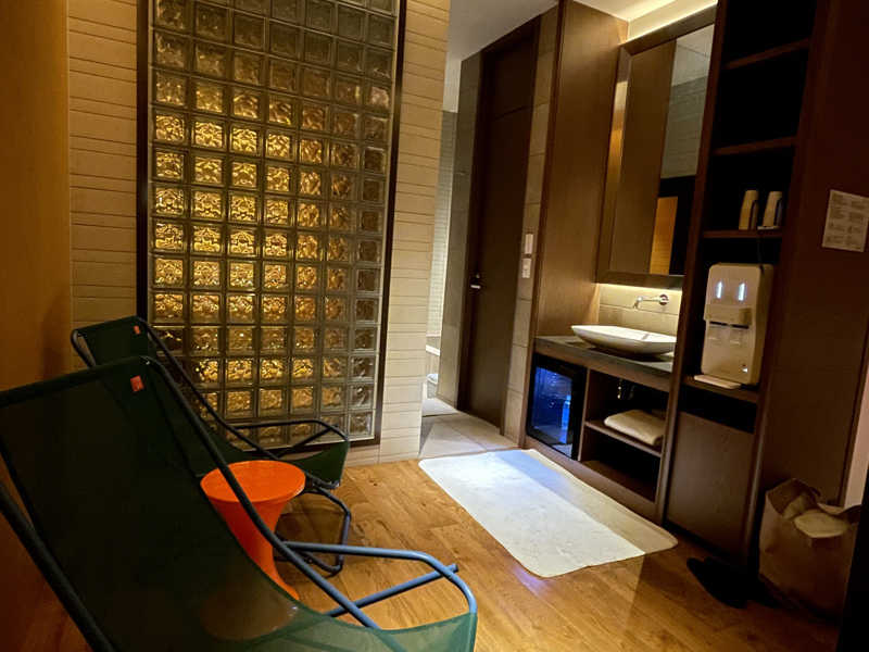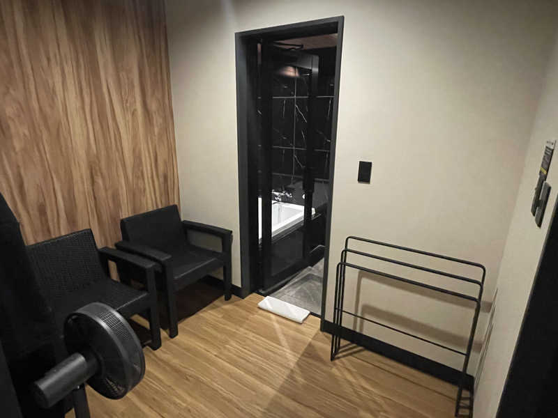 サ室を出たら2歩で水風呂。あらかじめ水を張ったうえに製氷器から氷もIN。水温計もあったから、ちゃんと自分好みの水温にできるよ。今日は冷たすぎずの18〜20℃で調整。誰にも気兼ねせずそのままドボンできるのが最高。贅沢言えばもうちょい深さがあると完璧なんだけど、そこは何も言うまい。水風呂でたら、またもや2歩でととのいスペース。イスが2脚と扇風機が用意されてるから、自分の好きなようにレイアウトして休憩。今日仕事したことなんかはるか彼方へぶっとび。