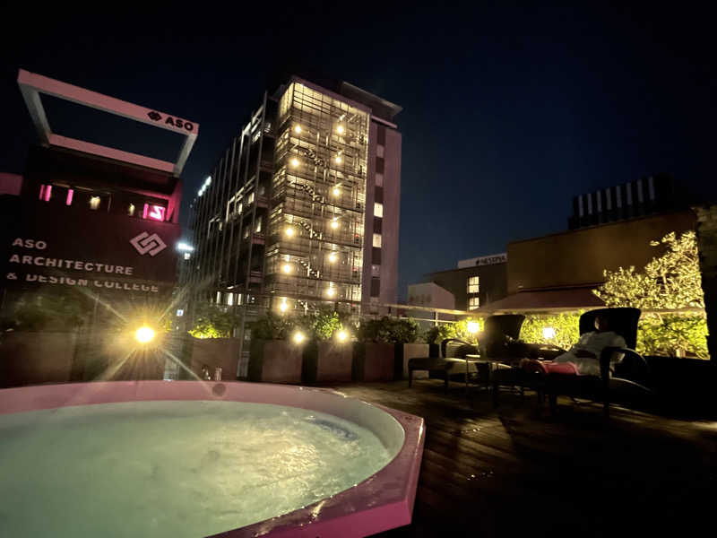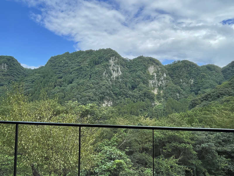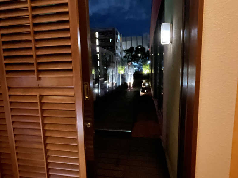 夕食後に本日の女湯「緑宝」へ潜入。こちらには岩盤浴もあるらしく、まずはそちらへ。専用の作務衣とバスタオルが用意されてる。薄暗くて静かな室内には、寝そべりタイプと背もたれタイプ合わせて6人分のスペース。せっかくなので15分ほど寝そべってみる。じんわりと背中が汗ばむくらい。ほどよく温まったところで大浴場へ。なかなかに広い。大きな湯船とサウナ、水風呂。露天には岩で囲まれた湯船に寝湯、休憩用のテラス席まである。さっそくお清めしてからサ室へIN。かなりの広さだけど誰もいない。座面は2段で、1段目のほうが奥行きあり。窓やテレビはないけど、ほどよいBGMが流れてる。温度は高めの92℃で、大きなストーブがあったけどオートロウリュとかはなさそう。それでも隅々まで熱が行き渡っててすぐに滝汗。サ室を出たら目の前が水風呂。隣にぬる湯もあったから、そっちで掛け水してから水風呂へ。キンキンではないけどやわらかな水。ちょうど座って肩まで浸かれるくらいで、広さもあるから手足を伸ばしてしっかり冷やせる。休憩は露天のテラスにて。奥日田は山に囲まれてるから、夜はもう結構涼しく感じる。いつのまにか雲も晴れて星が良く見える。