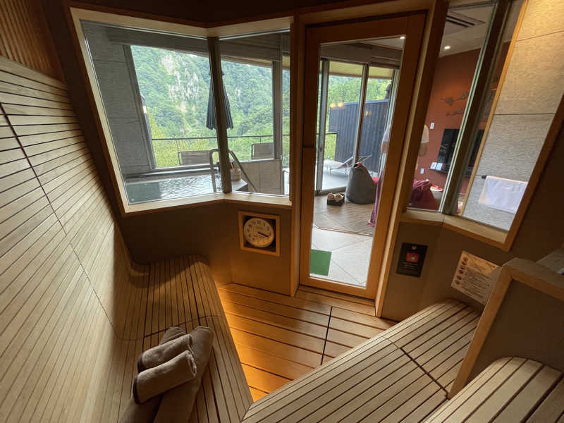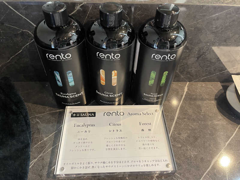 ではサ室へIN。4人くらいは入れる広さ。もうしっかり温まってる82℃。なんとタッチパネルで70〜95℃まで温度調節もできちゃう。かすかにBGMが流れてるけど、Bluetoothで好きな音楽もつなげちゃう。大きな窓があるから、部屋のテレビをつけておけば見えちゃう。なにこのカスタムサウナ。しかもロウリュ用にアロマオイルも2種類用意されてる。好みで変えても良いし、朝と夜で変えても良い。あ、これは部屋には戻れないやと確信。晩ごはんは18時だから、計画的にやらないと。