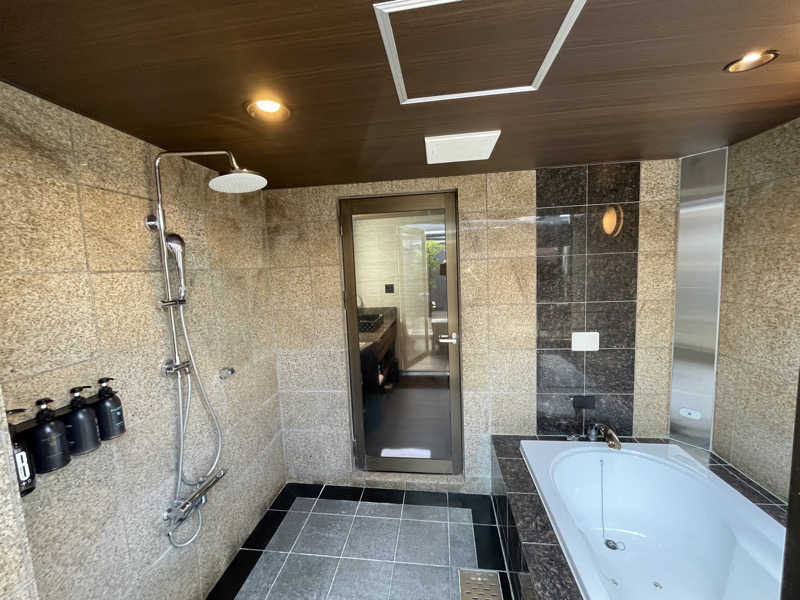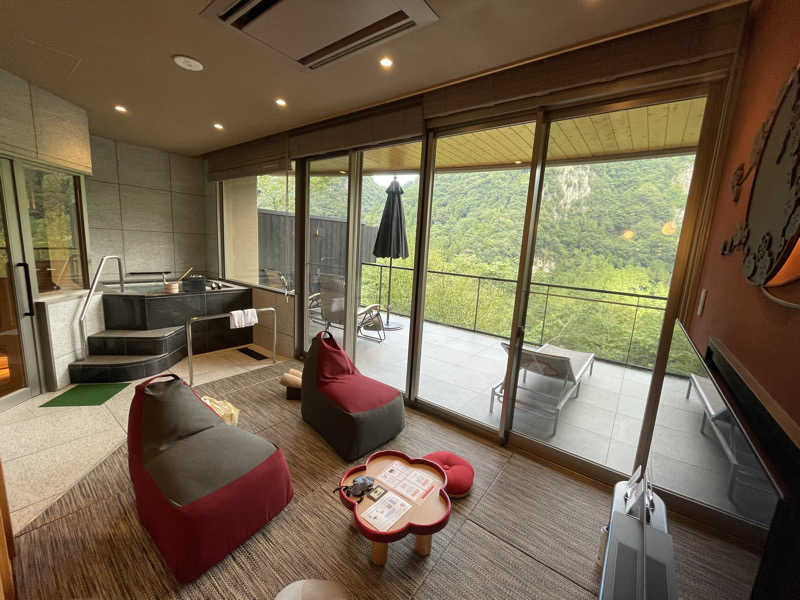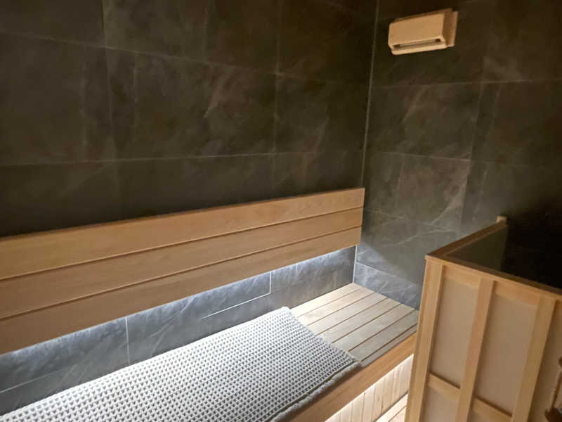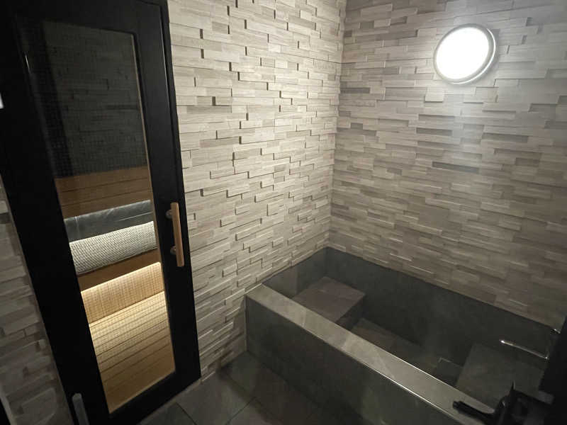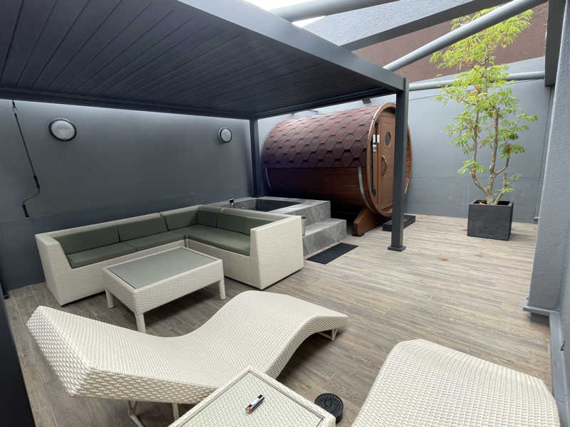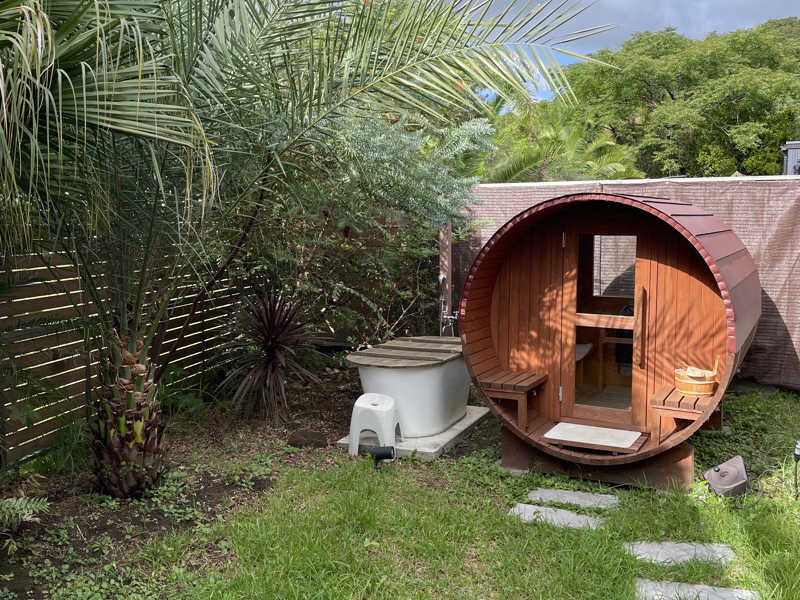 1セット目からしっかり発汗。一つケチつけるなら水風呂がふつうのバスタブに水だから、冷たさはそんなにないのが残念ではあるかな。氷を入れても長持ちはしないから、ストロングスタイルをお求めの方には物足りないかも。とはいえくつろぎスペースでゆっくり寛げば、そんな些細なことは気にならない。ちなみにアウトドアジャグジーとも行き来できるから、そっちのほうで外気浴を楽しむこともできちゃう。