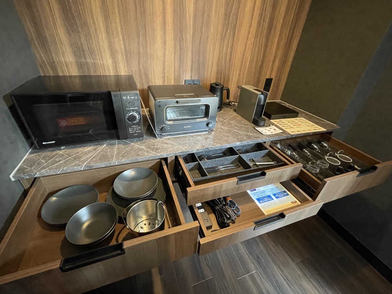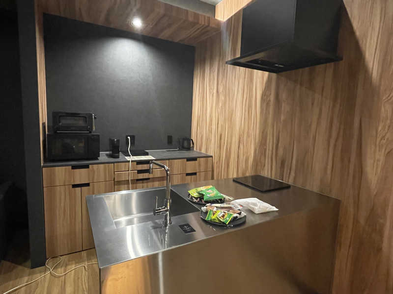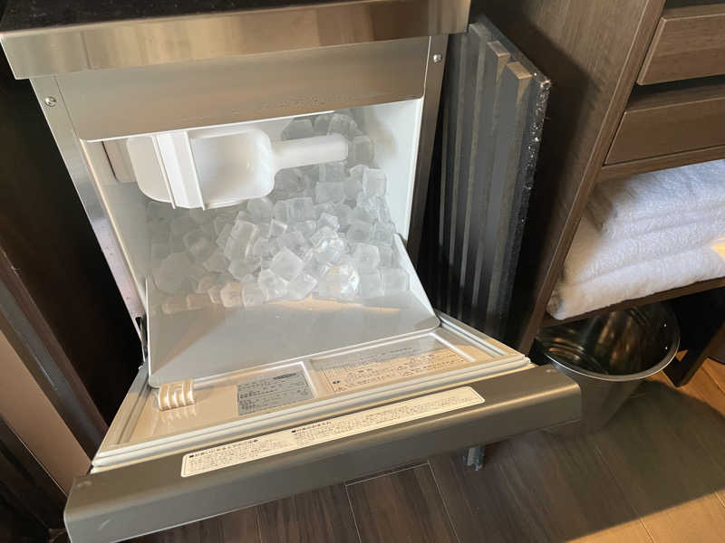 このホテルはサービスが少し変わっていて、食事、飲み物は全てフリースペースから自由に取っていくスタイル。料金はホテル代に含まれてるから、気兼ねなく利用しちゃってOK(ただし持ち帰りや必要以上の食べ残し等はダメだよ。ご利用は計画的に)。全部の部屋に電子レンジやトースターが完備されてるし、今回のグレードの部屋ならIHコンロまであるから、食材持ち込んで簡単な調理なんかもできちゃう。これはセルフパーティーにはもってこいだね。さっそくおつまみとお酒を失敬して酒盛り開始。部屋に業務用の製氷器まであるんだもん、エンドレスに呑めちゃうよ?とは言いつつ、泥酔しちゃったらサウナ入れなくなるから、いい感じのところでサウナスイッチON。3時間で自動でOFFになる設定。だいたい40分くらいで90℃近くまでになるみたい。温めてる間にシックなバスルームでお清め。バスタブにはジャグジーもあったよ。