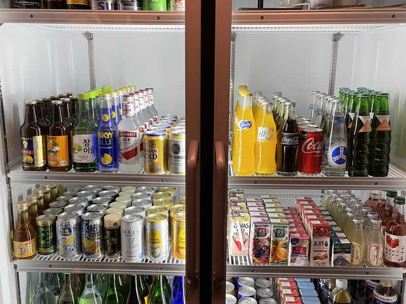 まずはチェックイン。今どき珍しい、フロントからスリッパに履きかえるスタイル。プールと本館を利用する場合は外履き用スリッパを使用するみたい。簡単に館内の説明を受けて、さっそく別館宿泊者専用のラウンジへ。なんと夜10時までお酒も飲み放題。ビールとハイボール、レモンサワーのみとは言え、このサービスはホントに助かる。かるく引っかけてからいよいよ大浴場へ。