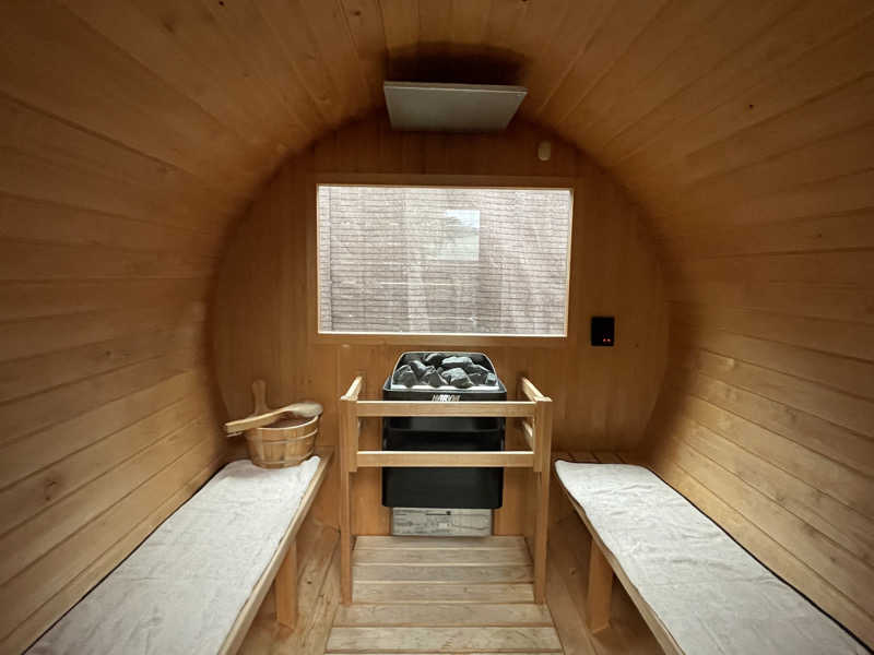 さてサウナはバレル式。窓はあるけど景色は壁なのはちょっと残念。衝撃展開だったのが、サ室内に照明が全く無いうえ、テラスの照明までもが22時で落ちるというもの。つまり真っ暗闇のサウナ。ケータイで足元を照らしながらサ室へIN。