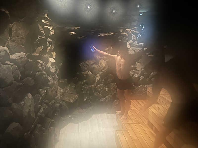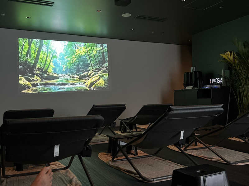 サウナは3段、寝そべりスペースが2つ、テレビがありそこには焚き火の映像が流れていて木が燃えてる音が聞こえる。00分と30分にオートロウリュあり、壁にもオート霧吹きがあり水がかけられる。(スタッフも霧吹きをたまにしにくる)65℃とは思えない暑さ、めちゃくちゃ汗が出る。時々スタッフによる換気あり。