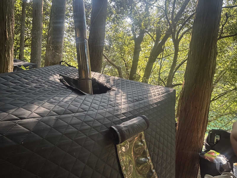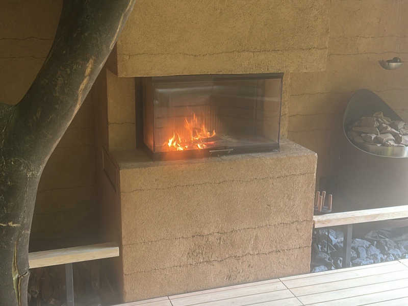 山サウナはその名の通り山のように段ができていてサウナストーブが二つあり暖炉もある。オートロウリュが毎時15分と45分にある。サウナの中に木が2本植えられていて、匂いを感じることができる。