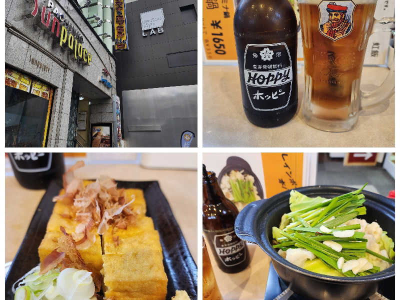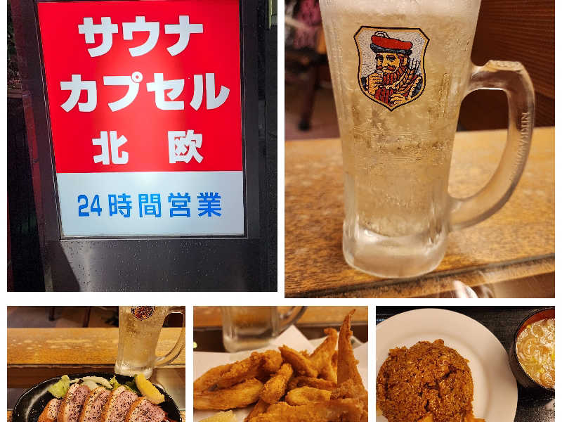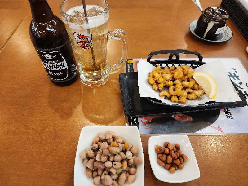 3セット後は不感湯。そして、お食事処でメガハイボールとおつまみ、シメ。少し寝て、さ、出るか。