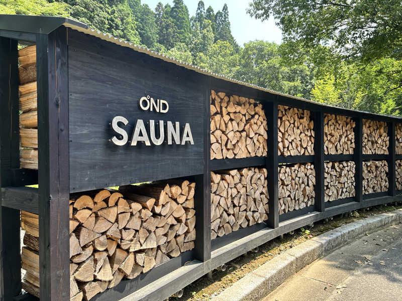 凄まじい薪の物量を使用したウォール外構とロゴがオシャンティックですね