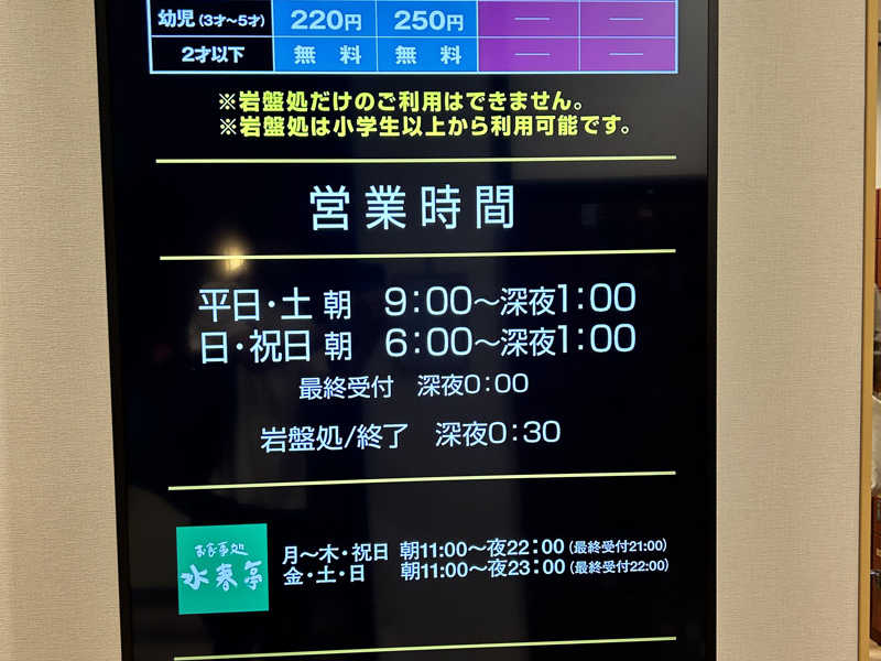 岩盤浴ではミュージックローリュもやってるらしいですが、今回は初入館で日も落ちてますから、次回以降ご検討
