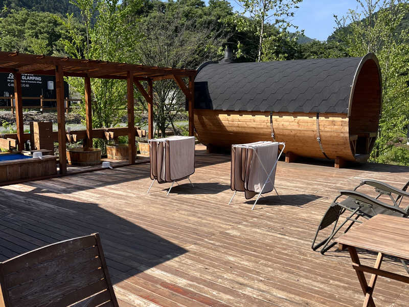 外の水風呂が外の小川から水を引いてるとの事、前日豪雨だったので少し色が付いていたが近々の1人用五右衛門水風呂。