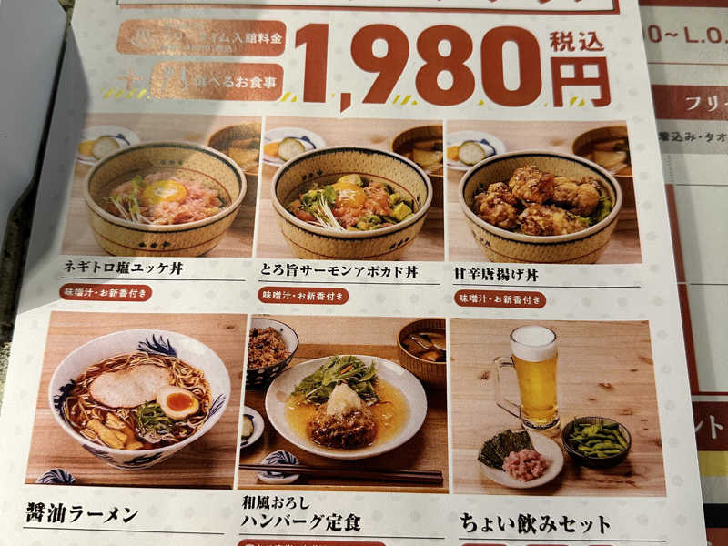 久しぶりに来たら、フリータイム入館+ご飯がついて1980円のプランが出来ていた。これは会員でも、会員じゃなくても利用できるプランとなっている。館内着は付いているが、なぜかタオルは+300円かかる😢ご飯は6種類から選べる。