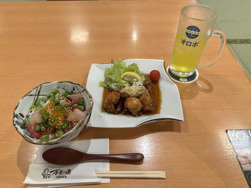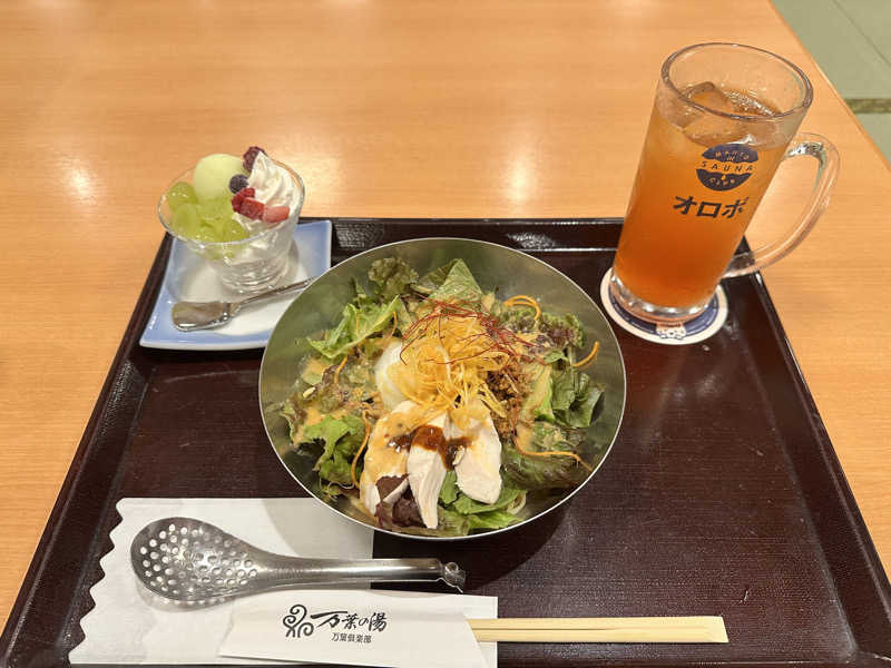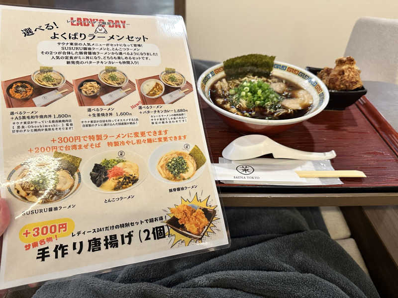 今日はLD限定のフリータイムセットプランもあったけど、2時間回数券と400円割引券を利用して入館。食事は頼みたいものを頼むことにした👍サウイキ特典のドリンクももらった。LINEクーポンでサ氷ももらった。
