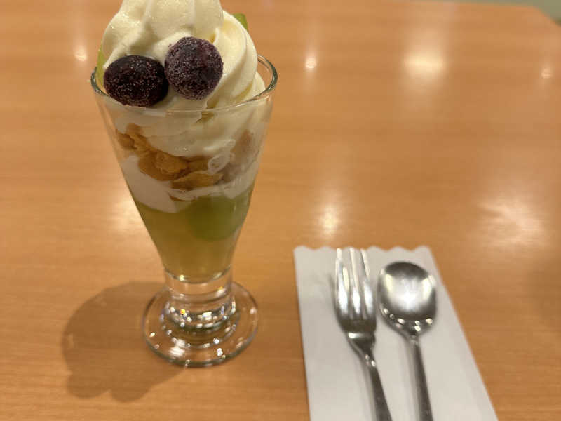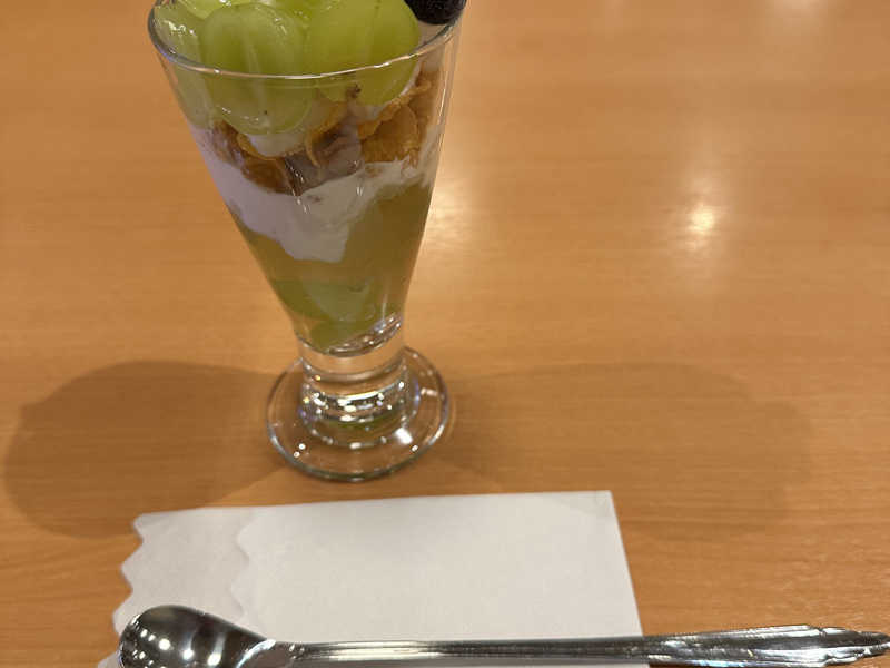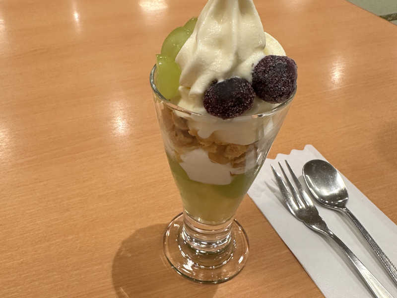 シャインマスカットのスイーツは、ドルチェとパフェを両方食べたが、パフェの方がお勧め。パフェ790円とお高めではあるが、中がマスカットゼリーになっていて、ソフトクリームとの相性が良い✨🍨