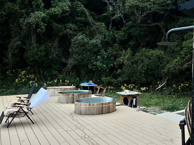 90分で5000円/人。水着、サウナハット、MOKUタオル、ポンチョ、バスタオル、オロポ飲み放題付き。目の前の絶景も貸切りでの値段ならお得と言ったところかな。