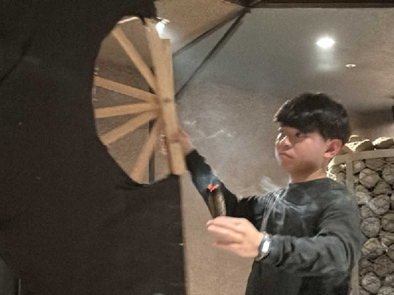お初のケイタさん、ラドルをタクトやバイオリンに見立ててのロウリュ、手の動きや所作が丁寧