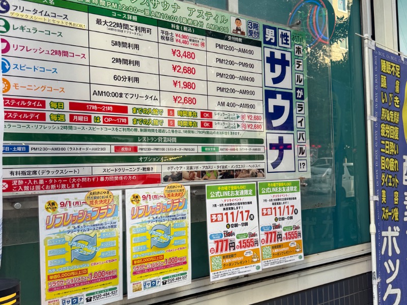 目的地は駅からすぐでパチンコ屋3階。エレベーター降りると清潔で綺麗なロビーで受付。コースはショートからロングまで色々あり今回は2時間割引を使い2400円ほど。
