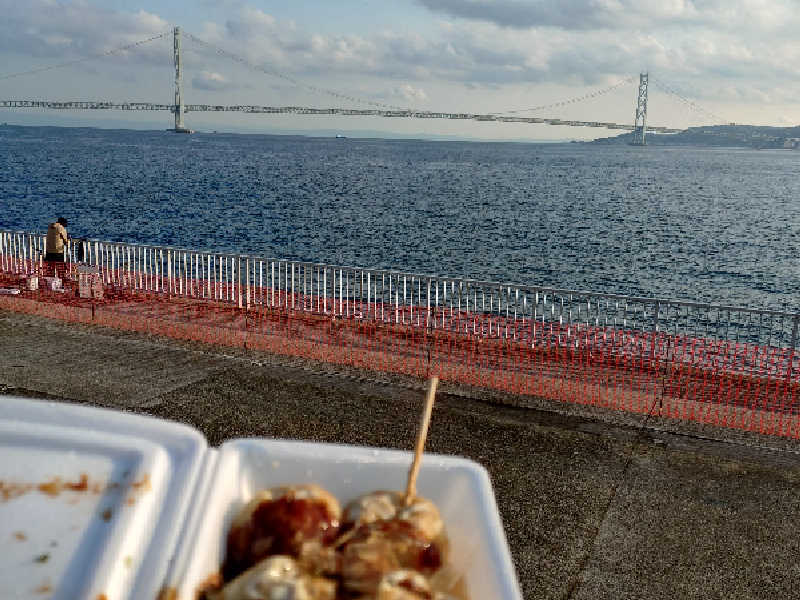 明石大橋をみながらぼーっとラ・ムーたこ焼きを食し撤収🏃🏃100円6個やけど腹ふくれるわ〜👏