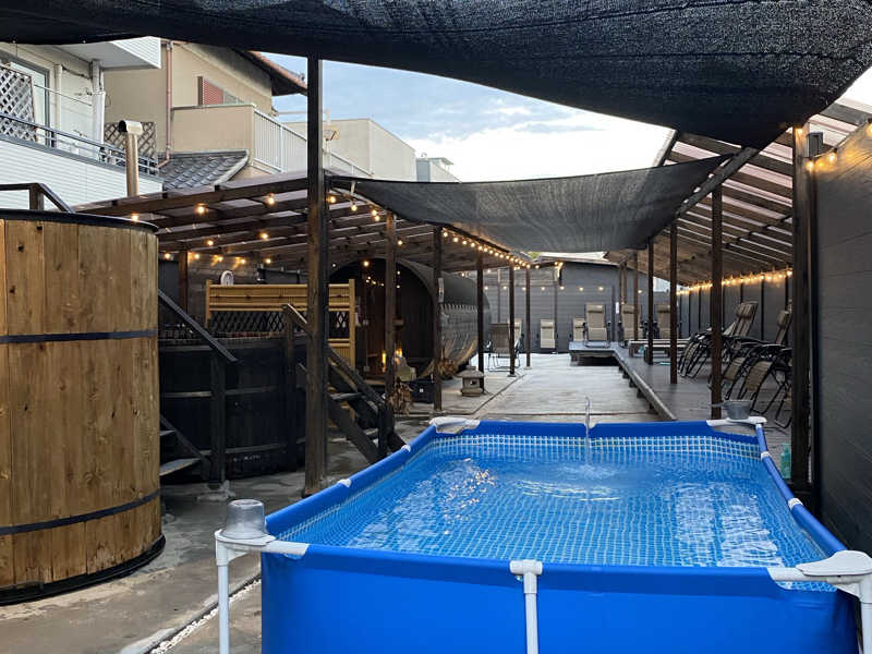 テントサウナは普通のテントサウナ。水風呂は空気で膨らませた子供用プールに水道水を入れたもの。ただこちらの地域は柿田川の湧水が水道水になってるらしく消毒はされてるが水温15度位でとても気持ち良い。長く入っていられる。