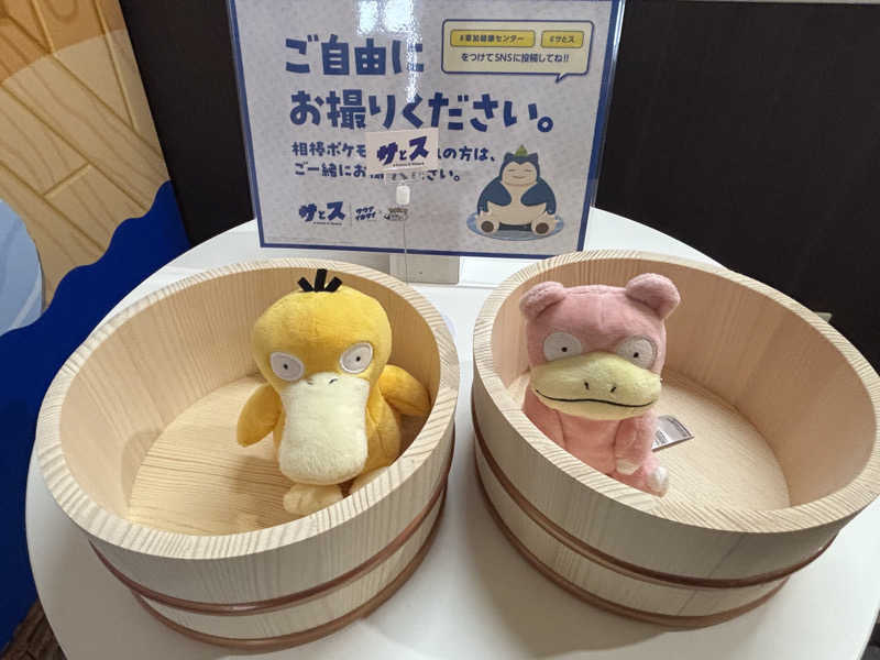 汗だくだくになったので、すぐ隣の水風呂へ。水風呂外にあるの嬉しい。ポケモンソフビが脇に置かれていた。