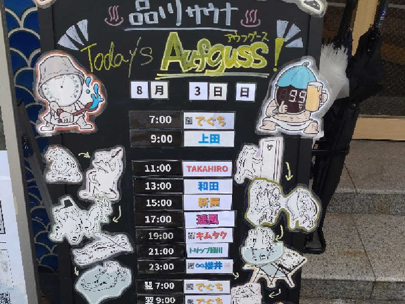 10:30到着、3人待ち。10分後に入場し、洗体・5分湯通ししたら、ちょうど11時アウフグースだったのでkuuに入場し2セット目途中7分で離脱し、グルシン水風呂30秒・ノーマル水風呂30秒後に3セット目並びさらに7分!